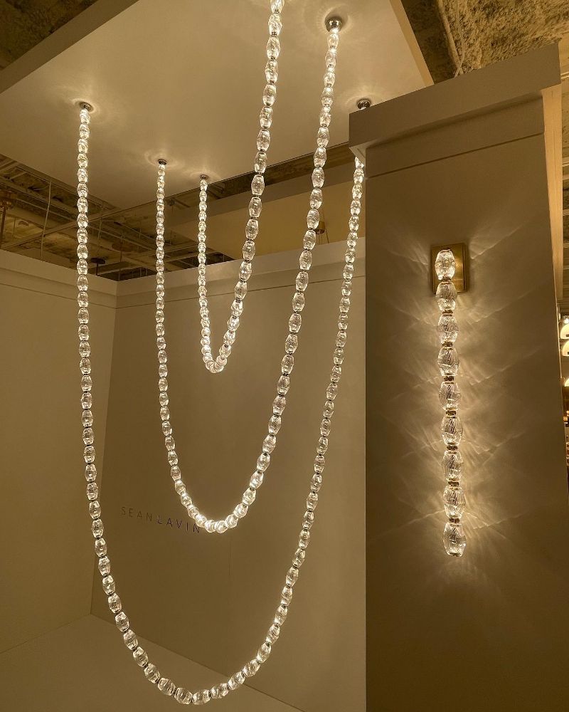 He explained that his inspiration for this light was a “beaded necklace”. After much experimentation to try and create an LED string of lights, on a trip to Vietnam, Sean spotted some votive candle holders. He put them back to back. Voilà! Finally the perfect combo of crystal and soft lighting came to life.